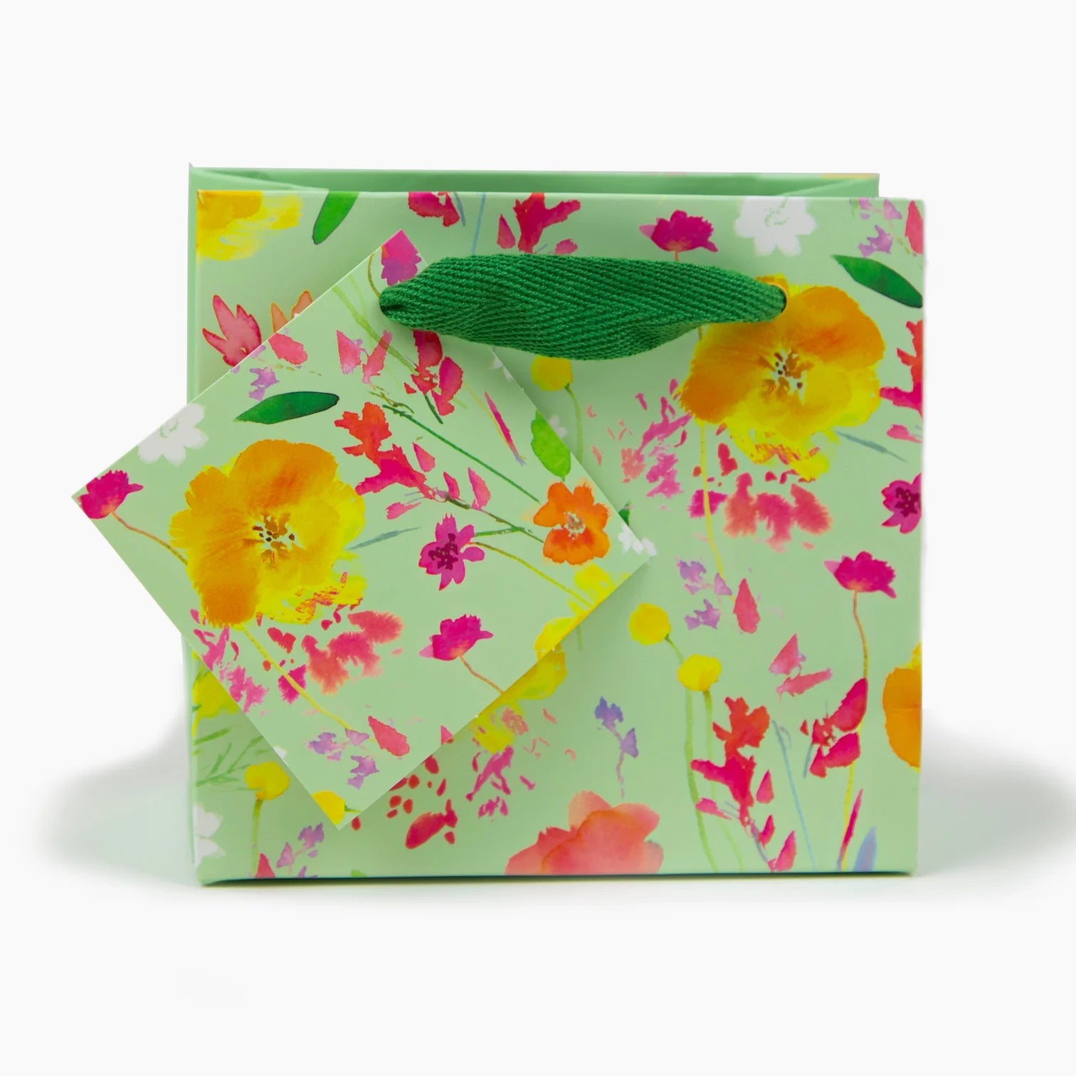 Compact and full of charm, this gift bag showcases a lively floral pattern in warm, vibrant tones. Its sturdy green handles ensure easy carrying, while its size makes it ideal for smaller, thoughtful gifts. A sweet way to share a bit of joy.