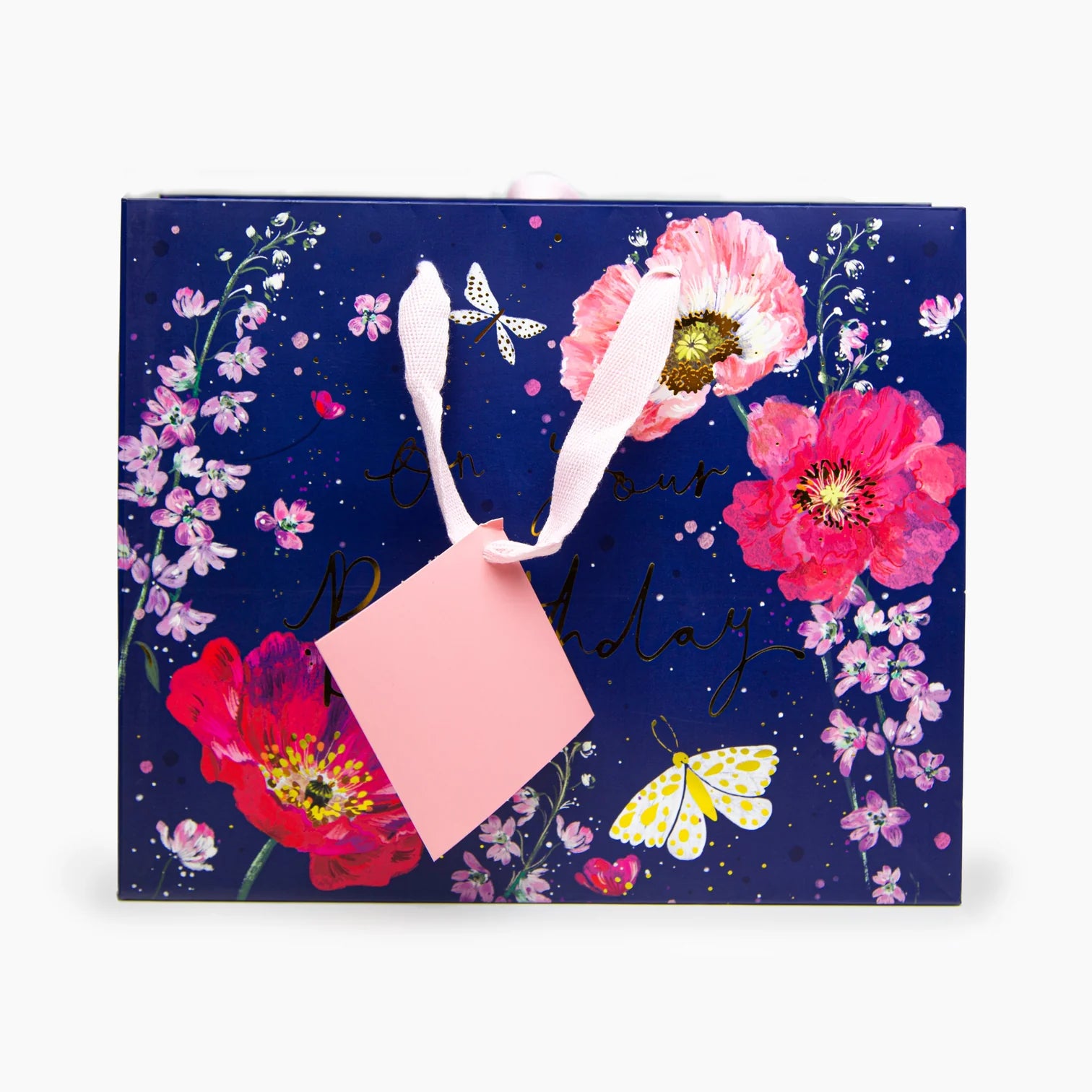 This exquisite gift bag brings together a deep navy background with a cascade of vibrant floral accents. Golden lettering adds a touch of luxury, while soft pink handles provide a delicate and practical finish. A beautiful way to make your birthday gift feel even more special.