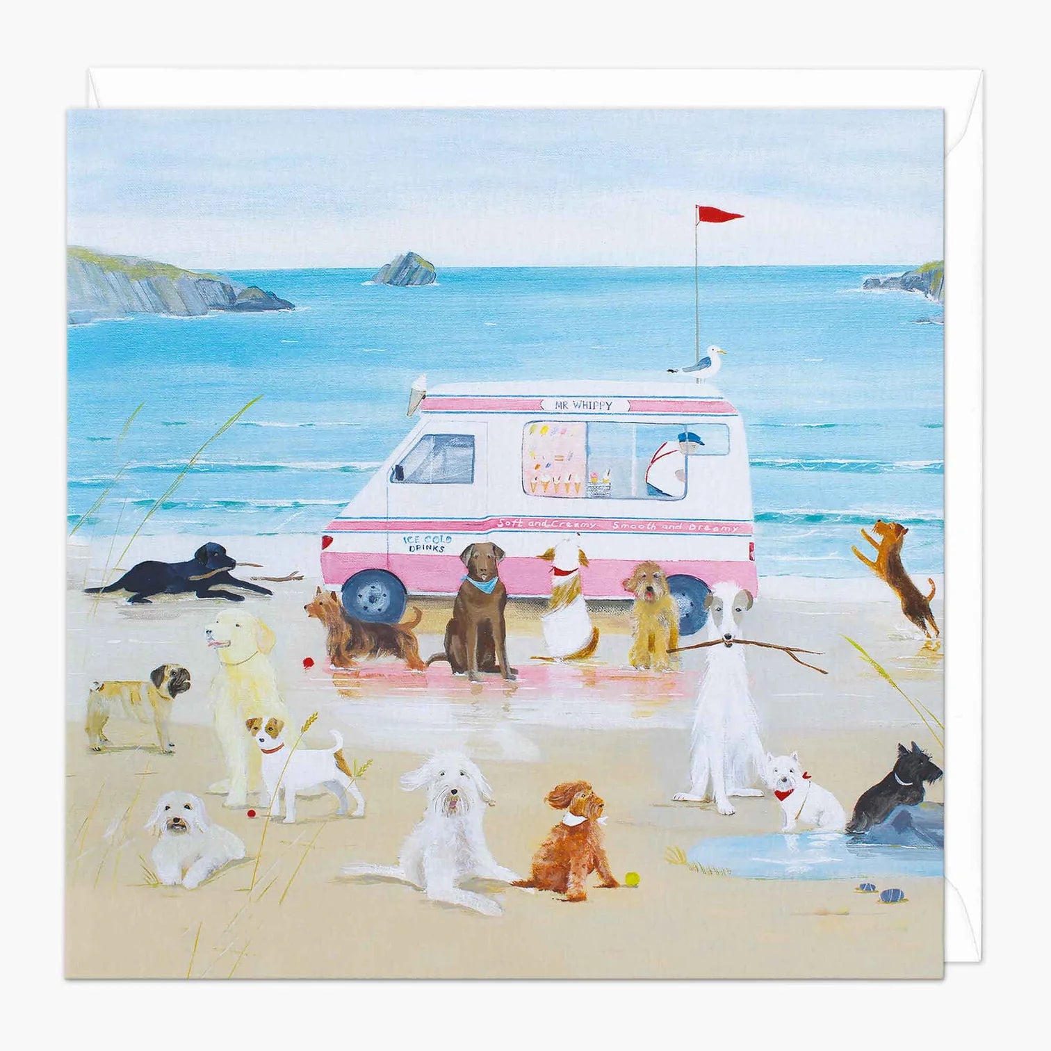 A playful seaside scene by Hannah Cole featuring dogs enjoying the beach beside an ice cream van. This charming artwork captures the simple joys of a sunny day by the sea.