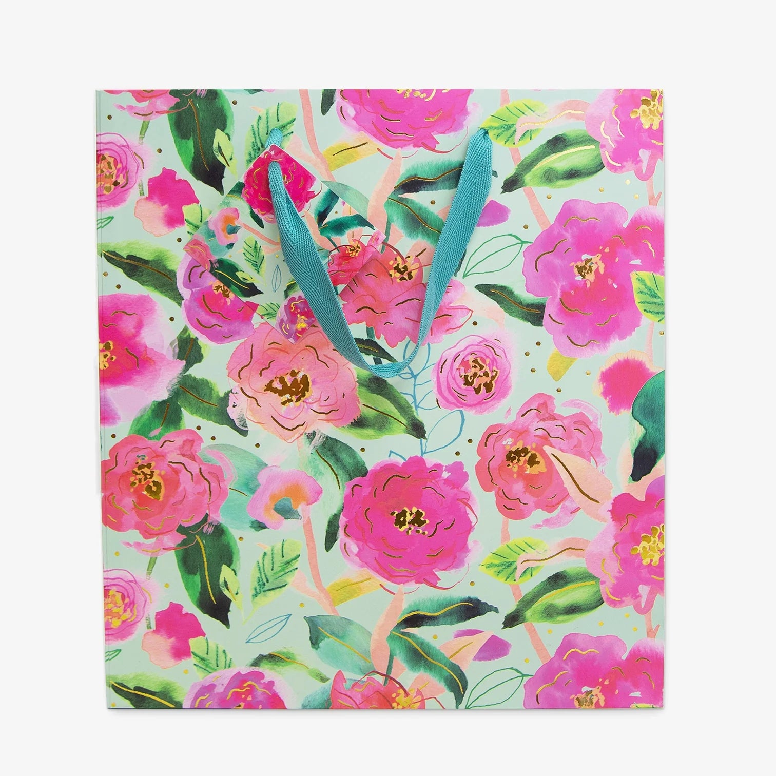 Perfect for any occasion, this large gift bag in the Aqua Camellia collection is adorned with vivid pink camellias. Its striking pattern paired with teal handles makes it a beautiful choice for wrapping your thoughtful gifts.