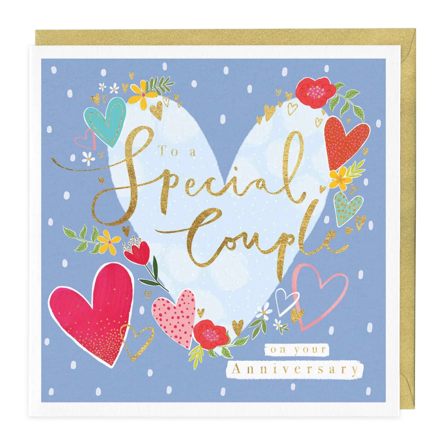 Mark the love story with our 'Special Couple Anniversary Card.' Designed for the occasion of love, the heartfelt hearts motif beautifully expresses enduring commitment. Enhanced with delicate gold foil accents, this card radiates warmth and sophistication. A perfect tribute to a special couple's journey. Share the joy of lasting love with this elegant anniversary greeting