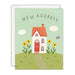 This product is plastic free and 100% recyclable.A pack of five high quality new address cards illustrated by Kate Mainard and printed on textured cream board. The image features a white house with a red roof and door, in a garden with yellow sunflowers'.