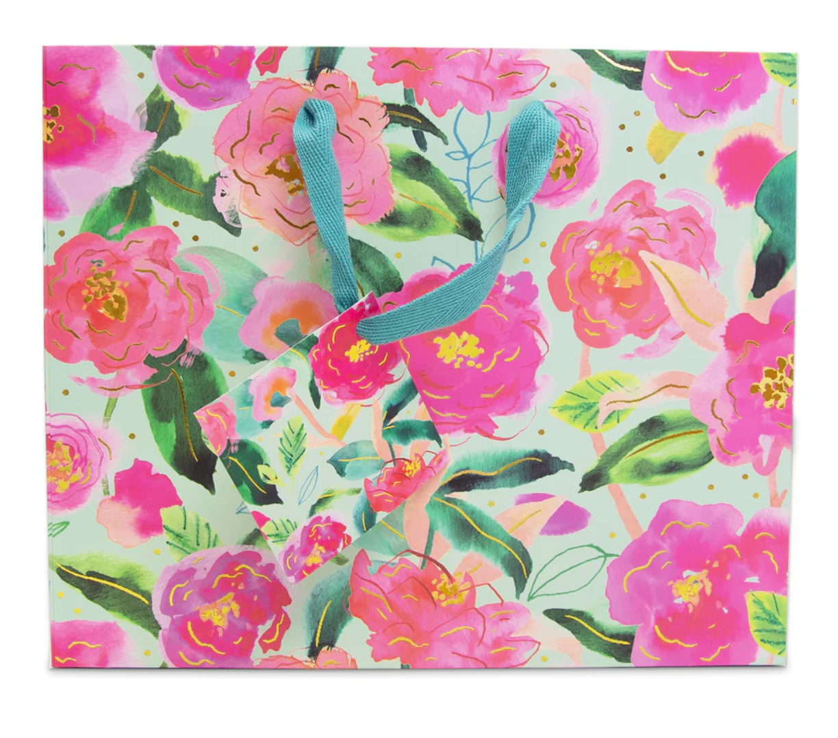 Gift wrapping becomes a delightful experience with this Aqua Camellia bag. Its bold pink blooms and soft green background make it a charming and eco-friendly option for presenting gifts with style.