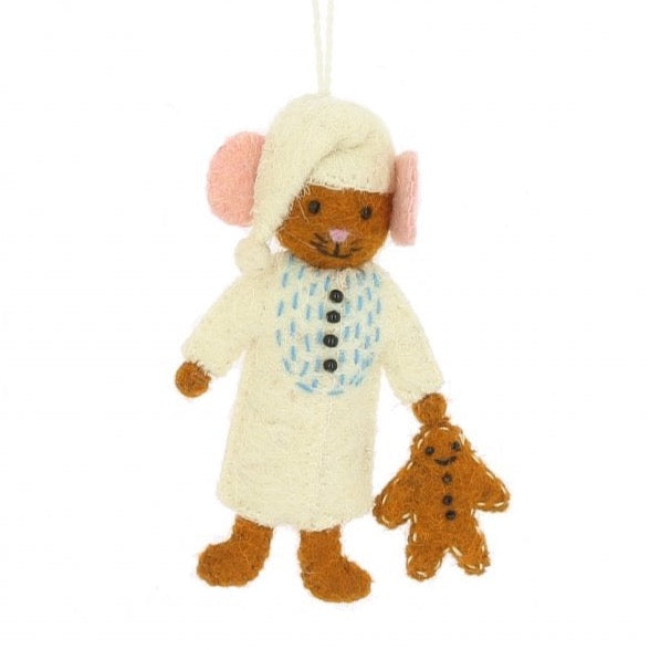 Wrap yourself up in the ultimate holiday cheer with the Nightshirt Mouse with Gingerbread Man! This festive felt mouse is outfitted with a cozy nightshirt, ready for a long winter's nap. They even have a little Gingerbread Man buddy to help keep them company!