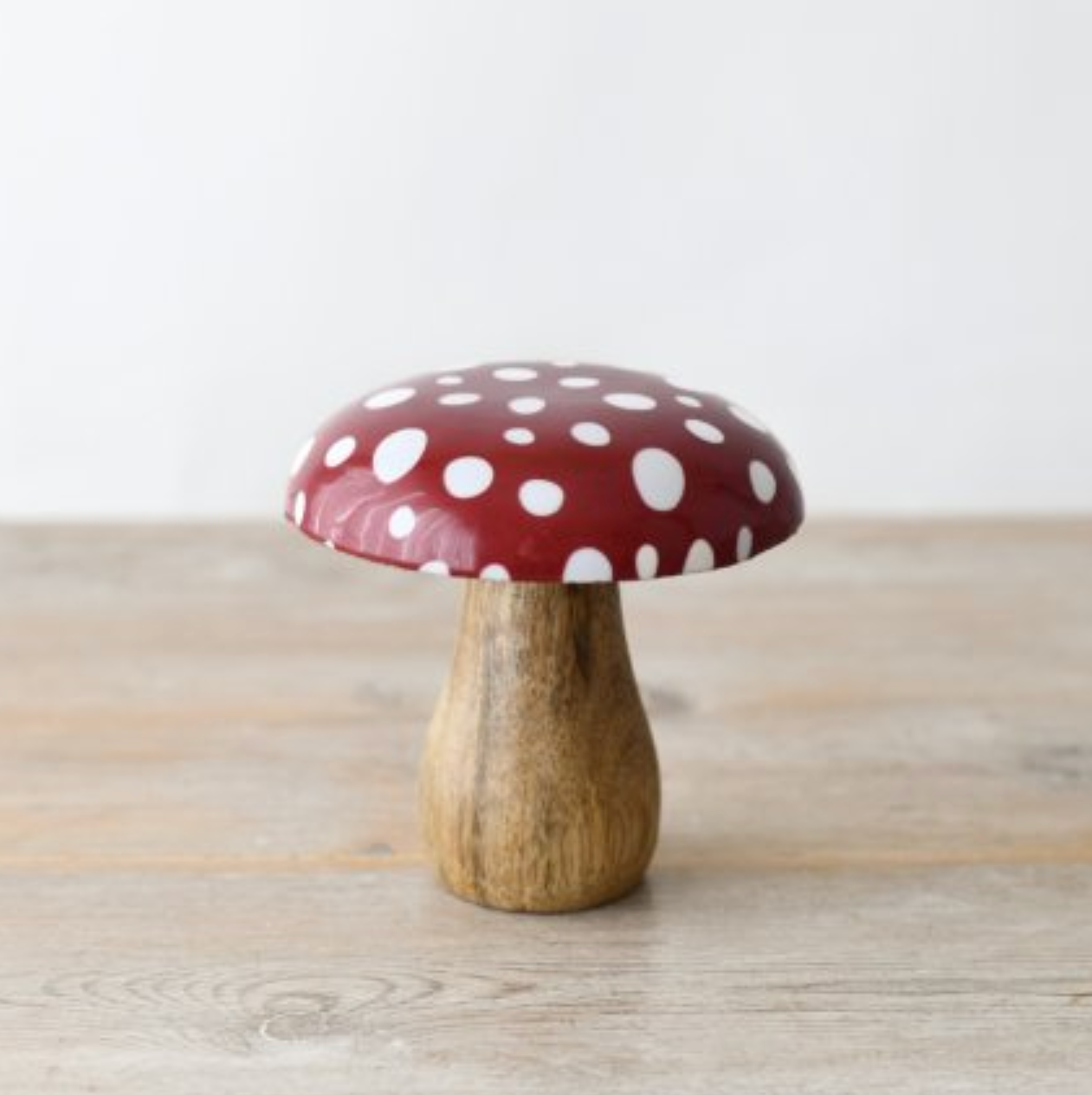 A traditional toadstool ornament made from natural mango wood with an enamel cap.