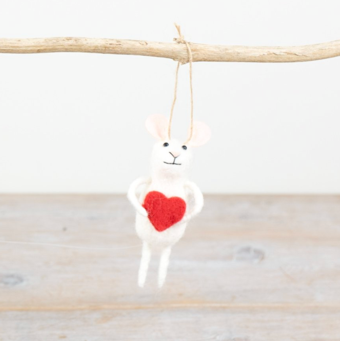 Featuring a felt mouse hanger in white holding an oversized red heart.