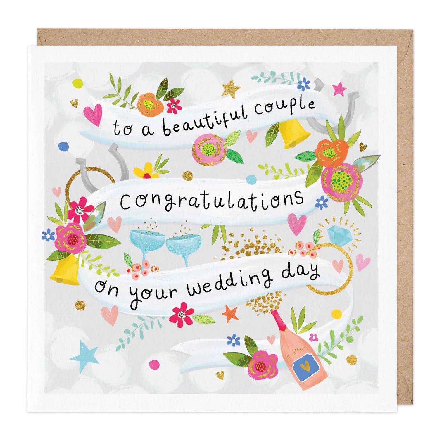 It’s good to keep old traditions alive, that’s why this card has it all. Show the beautiful couple your best wishes with this playful wedding day card. Gold foiling adds the finishing touches.