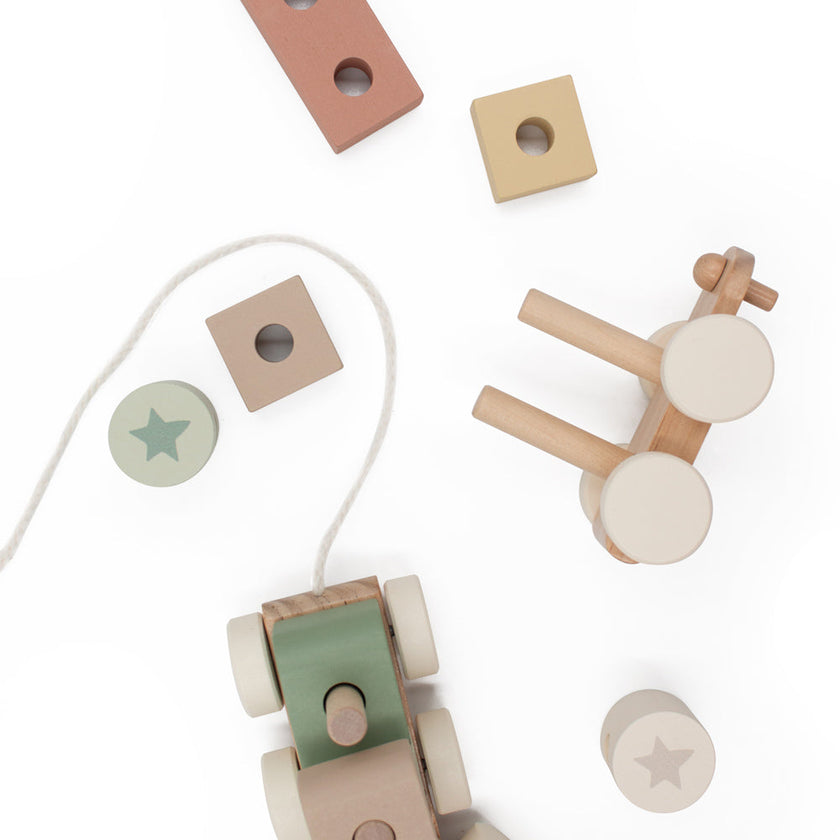 A delightful wooden stacking train featuring pastel blocks and engaging shapes. Encourages hand-eye coordination and problem solving through play. Beautifully designed in our soft pastel colour palette and clean, modern styling. Presented in a rope-handled gift box.