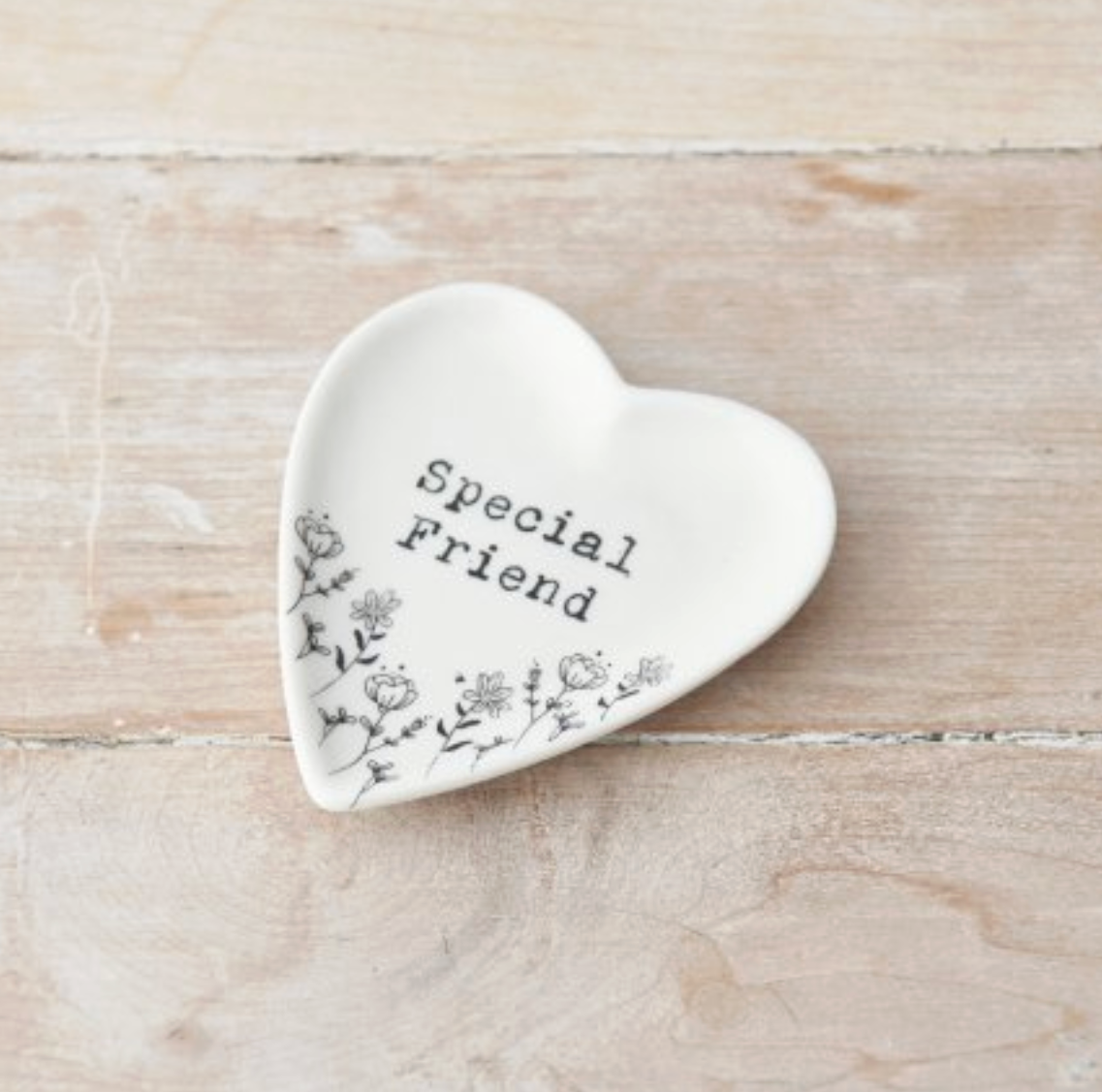 A pretty heart shaped trinket dish with a floral design and stamp style Special Friend slogan. A unique and practical gift item.