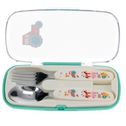 A charming two-piece cutlery set designed for children, adorned with bright and playful farmyard animals and familiar farm-themed illustrations on the handles, presented in a convenient carrying case. Sized just right for small hands, this set is perfect for mealtimes at home or when dining outdoors on picnics and journeys. Set includes fork and spoon, each approx. 13.5cm long