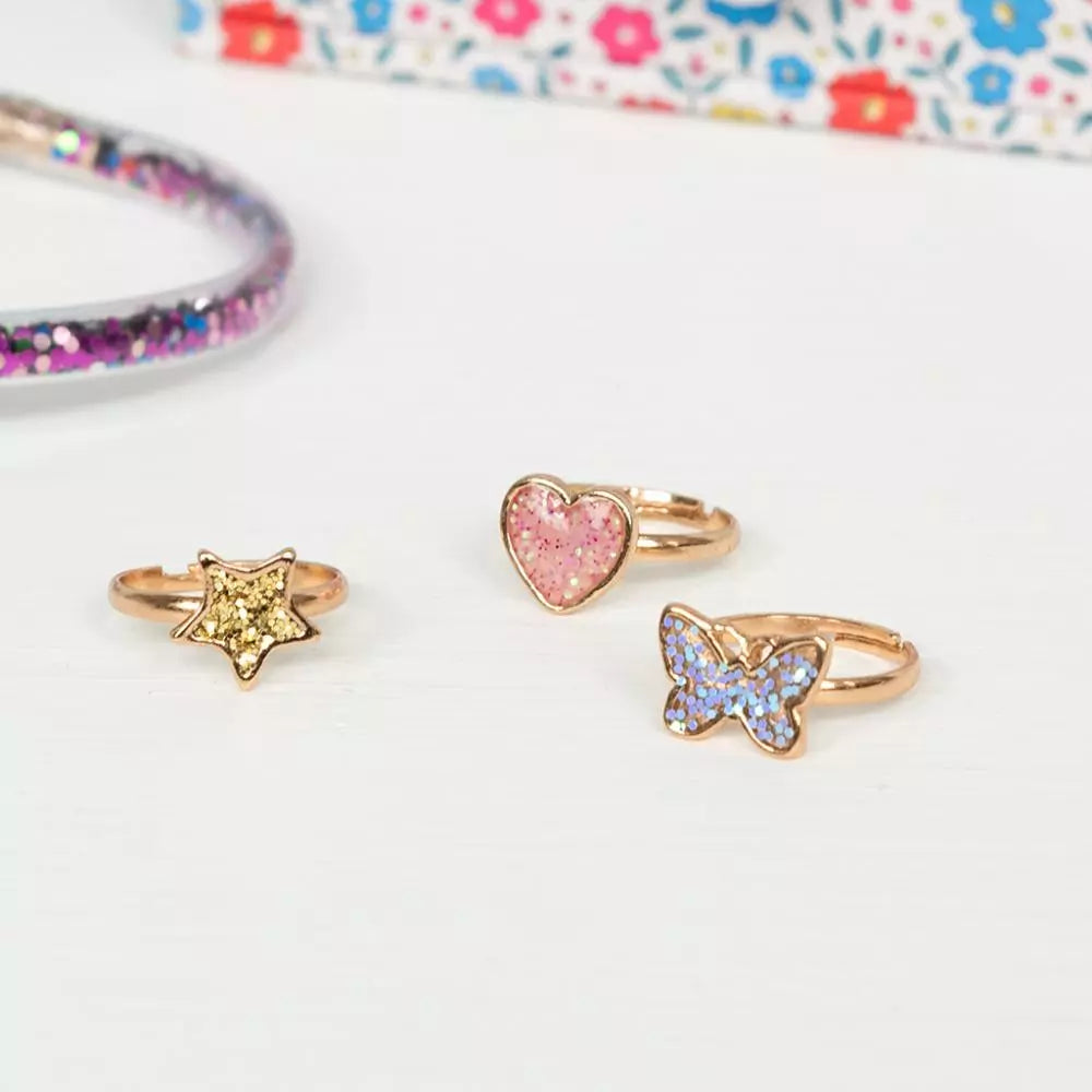 - Each adjustable children's ring features a different shaped 'gem': star, heart and butterfly