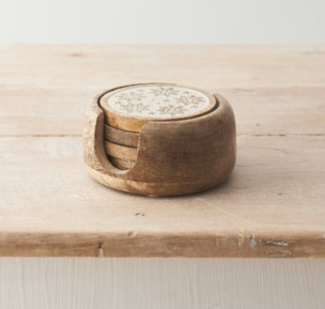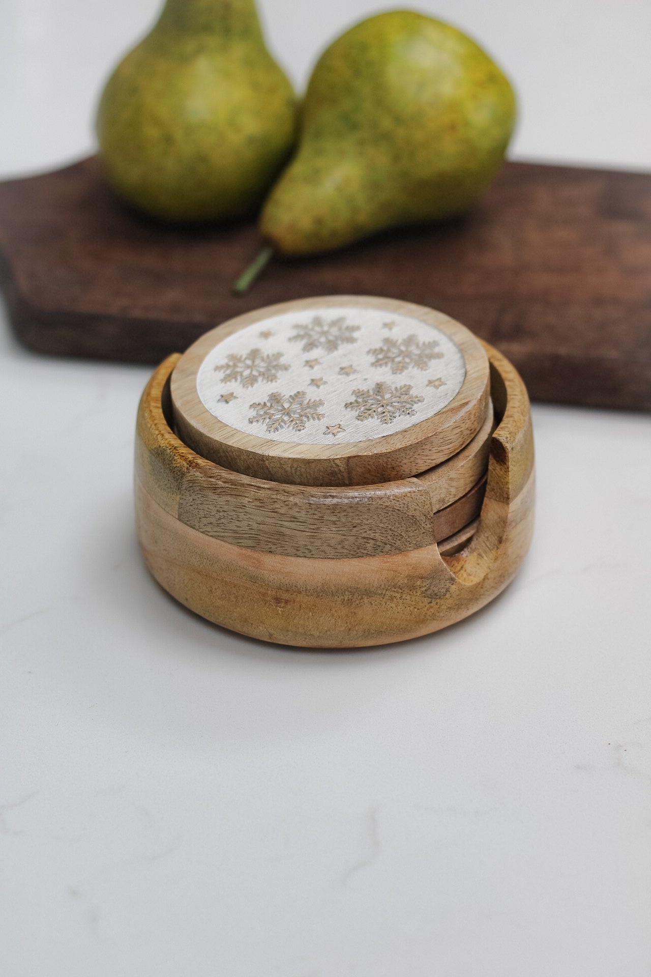 A set of 4 mango wood coasters featuring delicate snowflake and star patterns.