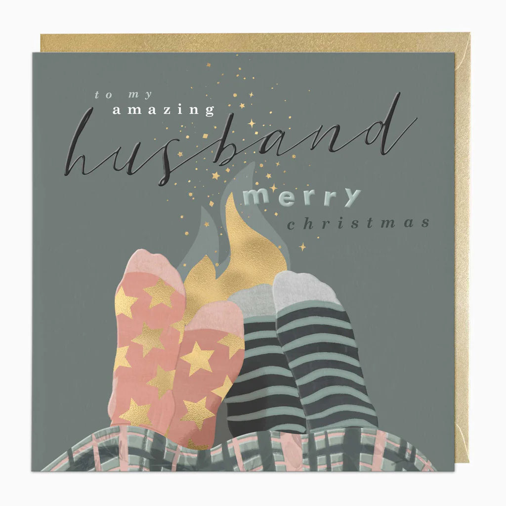 Striped and starry socks, a glowing fire, and a soft blanket—this scene says it all. A cosy card filled with warmth, perfect for your amazing husband.