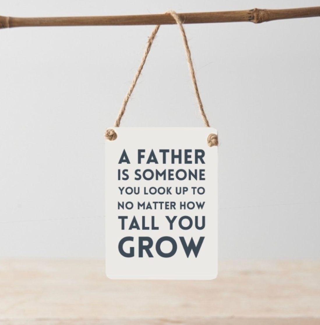 A father is someone you look up to no matter how tall you grow. A bold and stylish mini metal sign with a beautiful sentiment. Complete with jute string hanger and perfectly sized to pop inside of a greetings card.