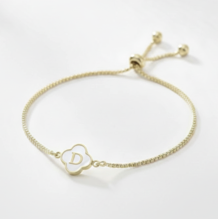 Add a touch of luck and sparkle to your look with our White Clover Gold Initial Bracelet! Crafted from 18K gold-plated stainless steel, this adjustable bracelet features a charming clover charm and a customizable initial from A to Z. Perfect for parties or gifting, it’s a playful way to keep your name - or a loved one’s - close wherever you go. Shine bright and show off your personal style with this dainty, lucky charm!
