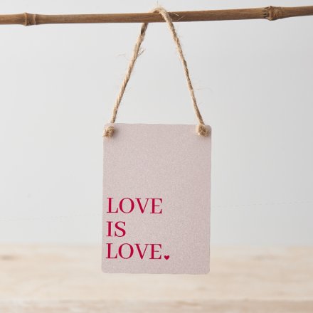A cute mini metal sign in a pretty pink colour with red text featuring "love is love" message alongside a heart detail. A sweet sign that would would make a thoughtful gift idea!
