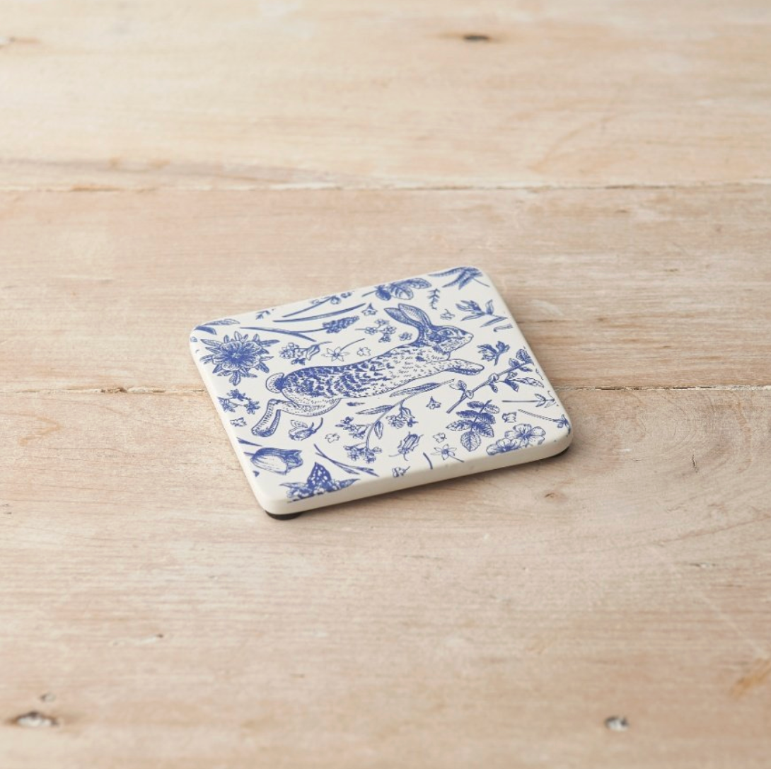 Protect surfaces with this beautifully detailed ceramic coaster featuring a jumping hare and seasonal flowers and leaves. With its bold design, beautiful blue hue and hand drawn aesthetic this is a must have seasonal accessory and gift item.