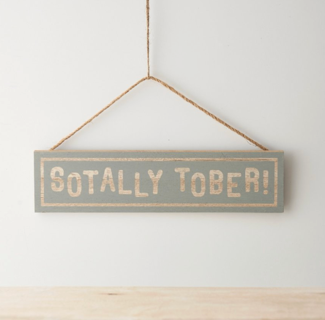 A hanging wooden sign with fun "sotally tober" text on a stylish grey background.