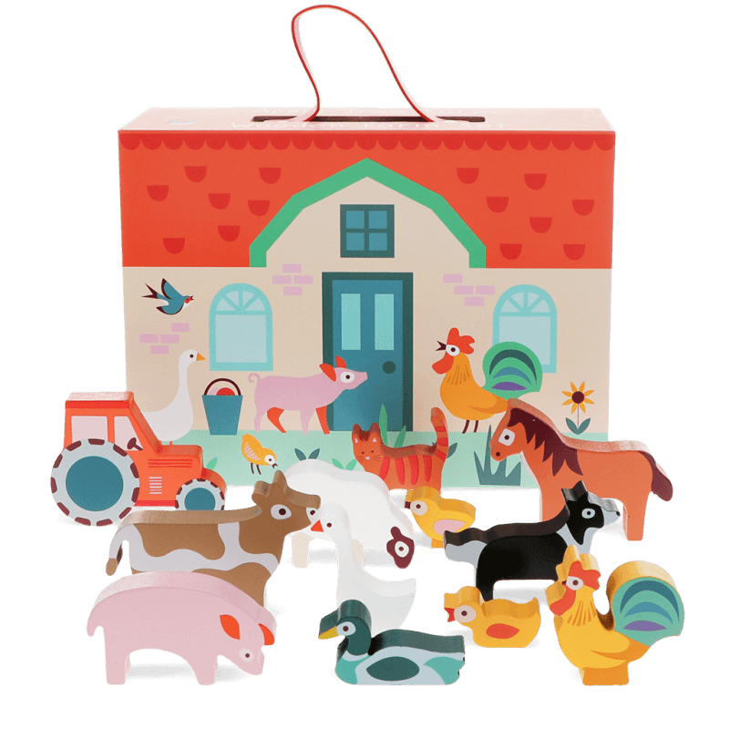 Enjoy hours of fun and laughter with this wooden farm playset, featuring a tractor and a range of farm animals. The set comes in a cardboard box that transforms into a barn with a yard once the lid is opened.