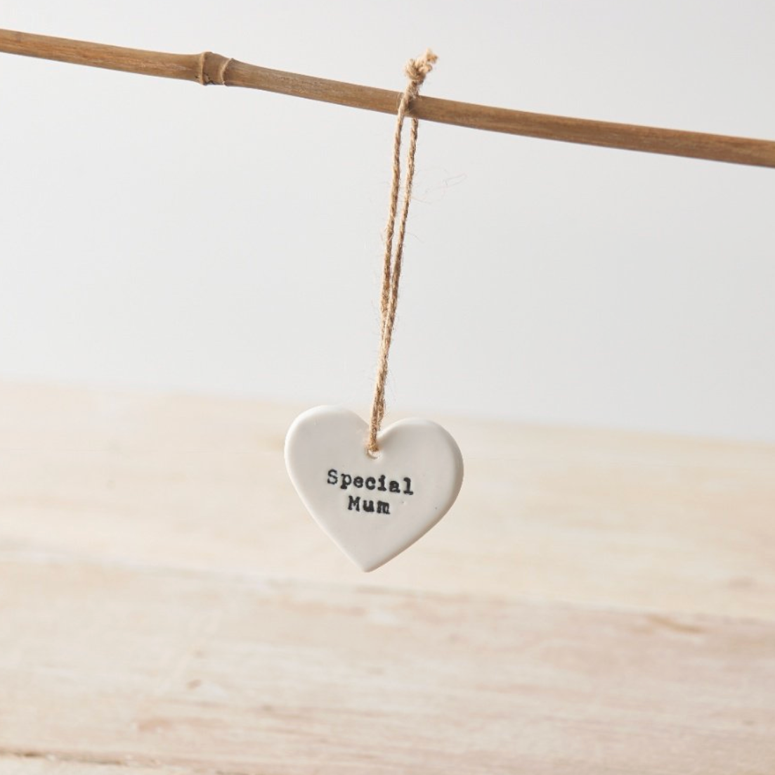 A white ceramic heart hanging decoration with twine hanger and "special Mum" message.