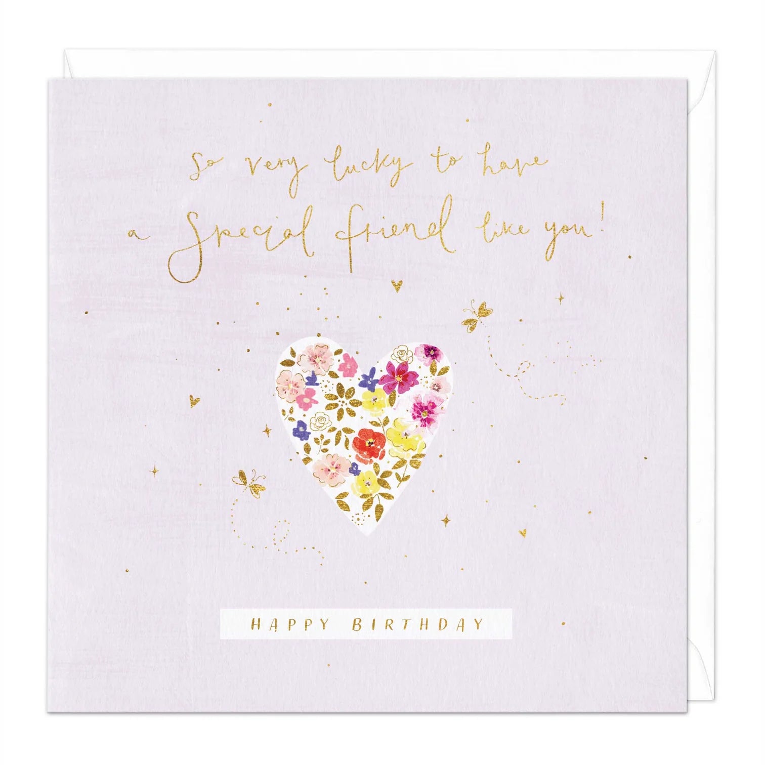 Share your love and celebrate your friend's birthday with this delicate card. At the centre, the design features a heart filled with colourful flowers, alongside the gold-foiled text reading "So very lucky to have a special friend like you!" as well as "Happy Birthday".