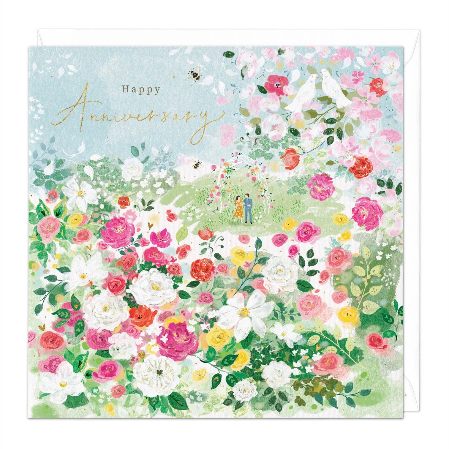 Wonder through the glorious rose garden with your significant other on your anniversary. This beautiful anniversary card adorned by flowers will take you back to the magical day you were married. Text on the front says 'Happy Anniversary'.