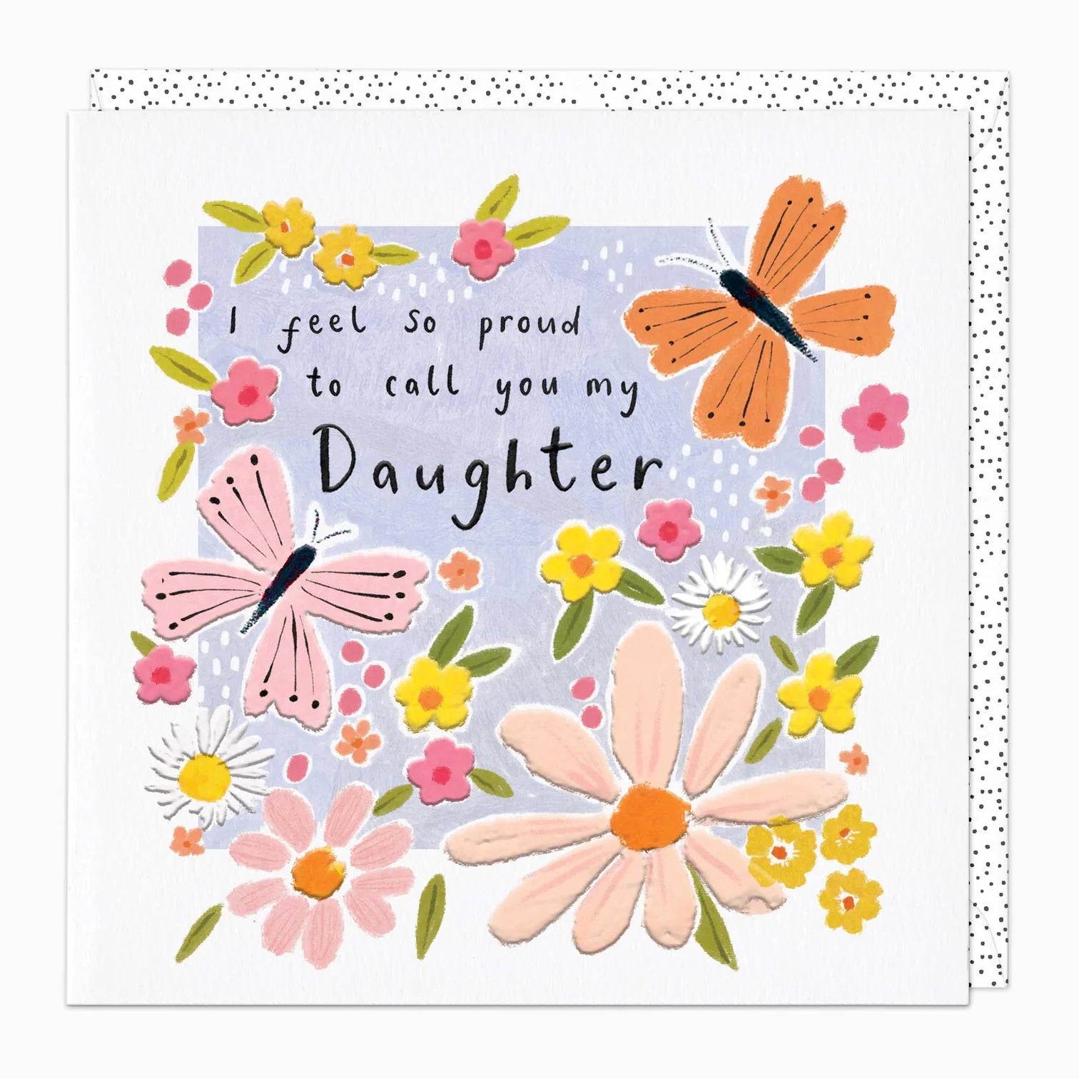 Sweet butterflies dance among a garden of cheerful blossoms in this joyful design. A tender card for a daughter who fills your heart with pride and warmth.